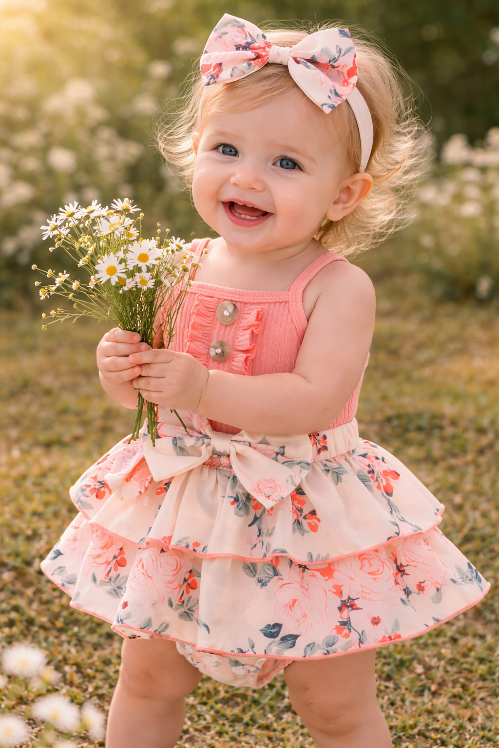 This darling floral outfit is the perfect blend of elegance and everyday comfort. Featuring a ribbed peachy-coral top with delicate button details and a beautifully layered skirt adorned with soft floral prints, it’s designed to make your little one look as lovely as she feels. The oversized bow adds a touch of classic sweetness, while the matching headband completes the look effortlessly.