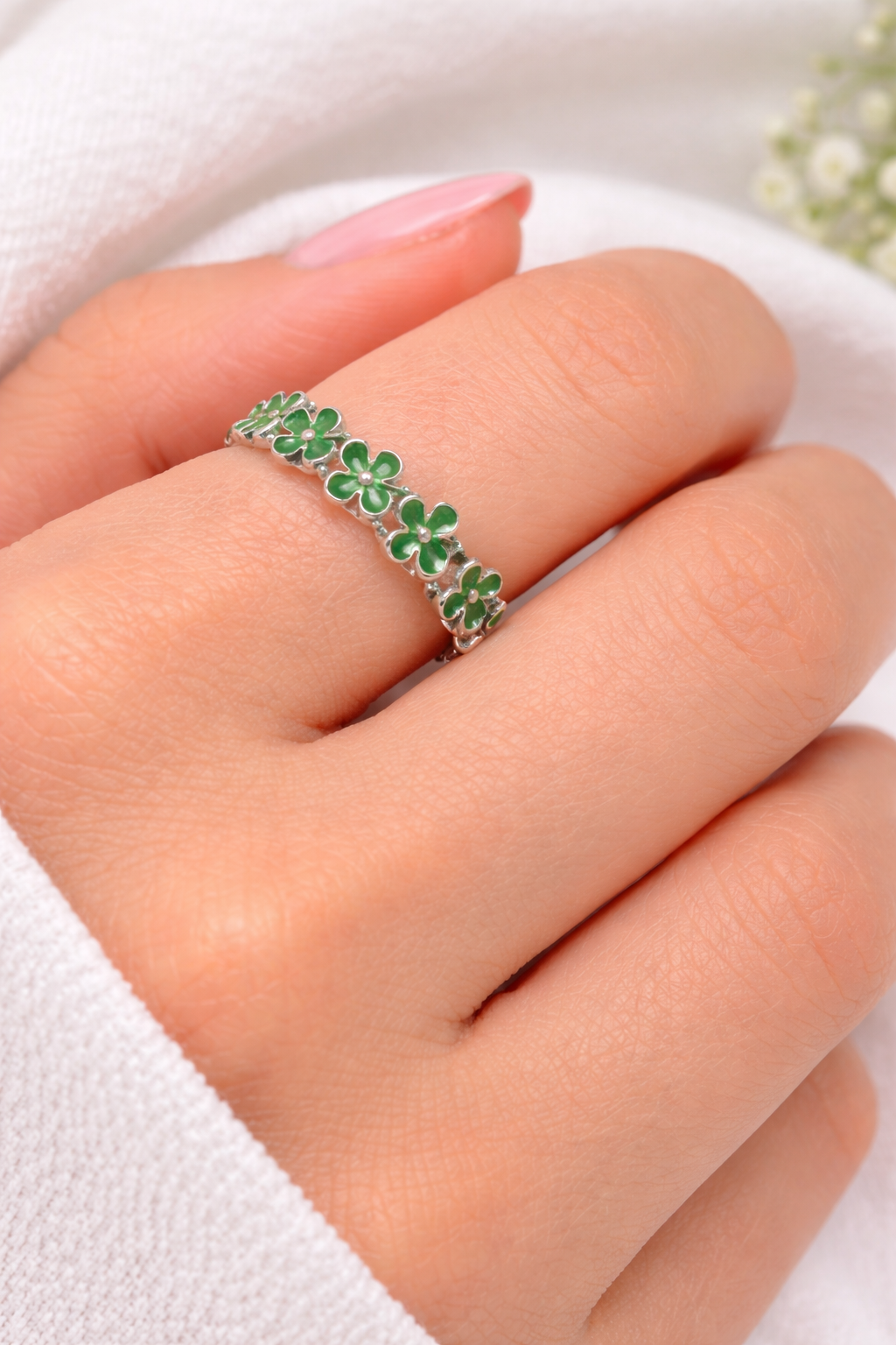 Designed with a continuous circle of green clovers, this ring symbolizes luck, harmony, and positive energy. The vibrant green clovers create a charming, eye-catching look that’s perfect for everyday wear or festive occasions like St. Patrick’s Day.