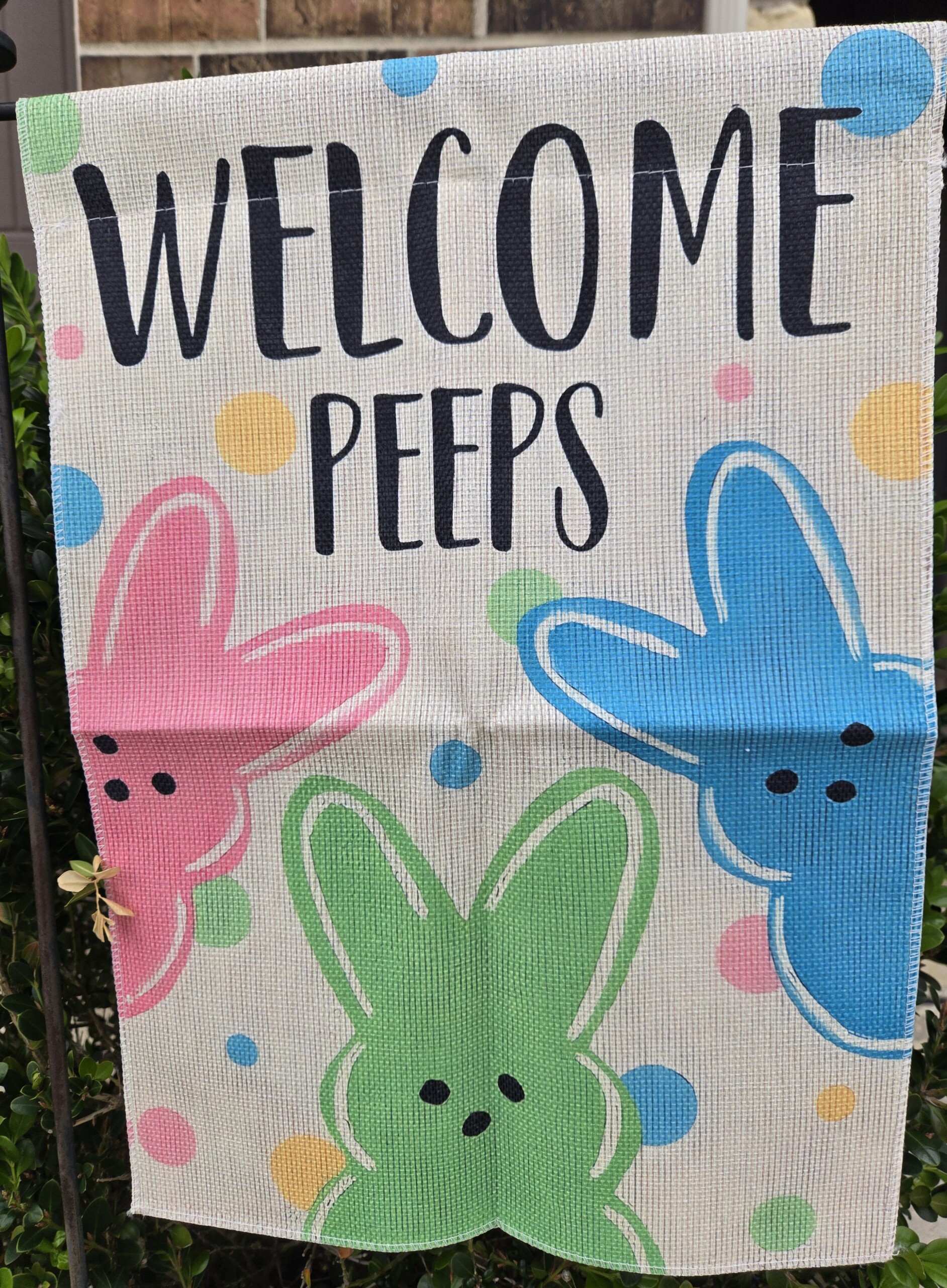 This cheerful “Welcome Peeps” garden flag is the perfect way to brighten your yard, porch, or garden for the season. Featuring three colorful bunny designs in pink, blue, and green with playful polka dots, this flag instantly adds a fun, festive Easter vibe to any outdoor space.