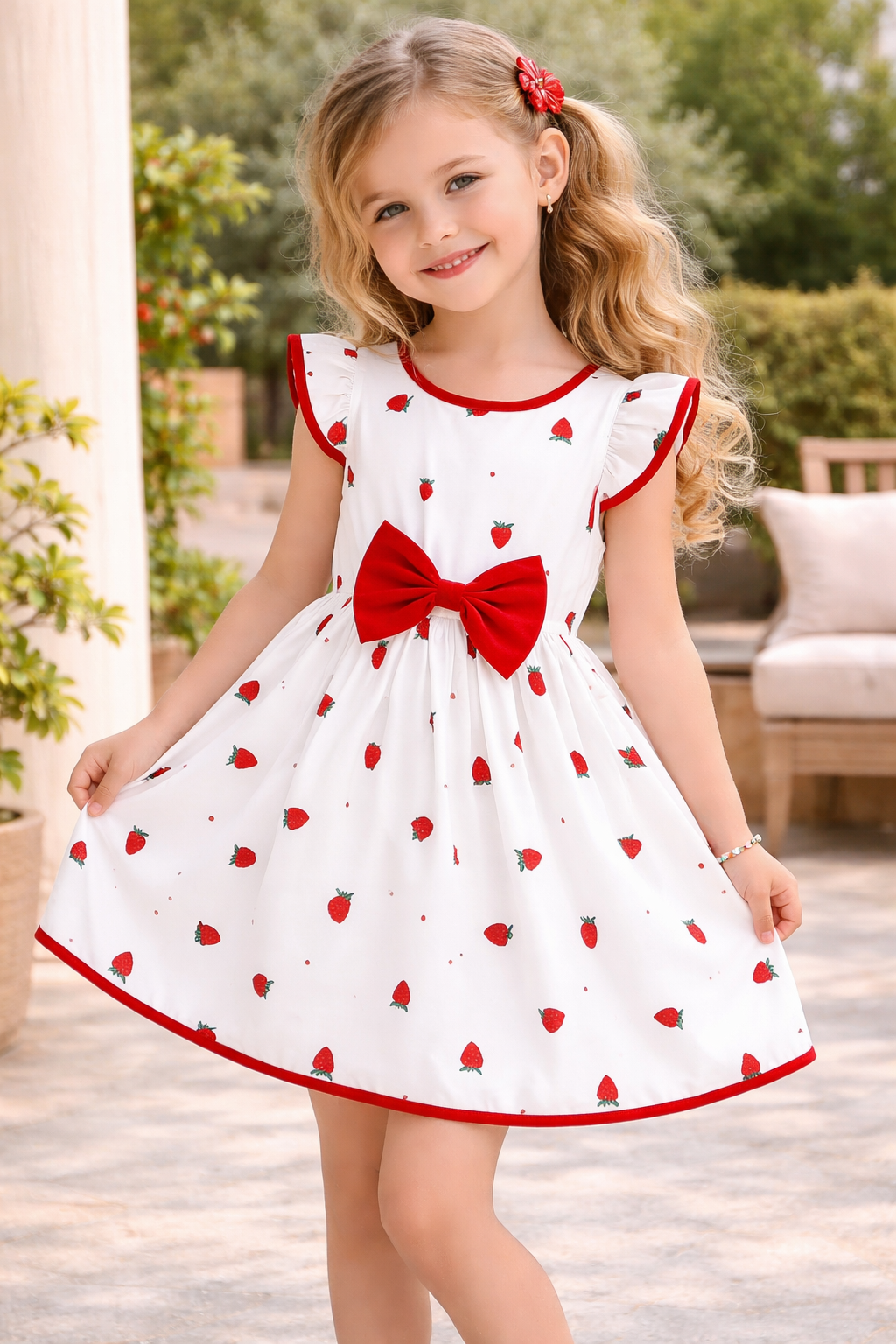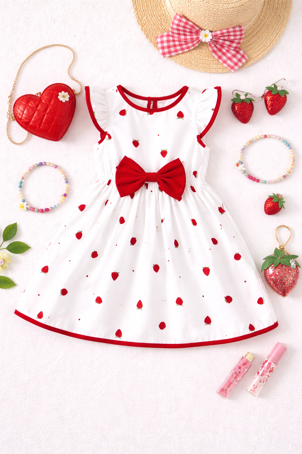 Designed with a soft white base and sprinkled with delicate strawberry prints, this dress features flutter sleeves and bold red trim for a fresh, eye-catching finish. The oversized statement bow at the waist adds the perfect pop of color and a touch of classic sweetness, while the lightweight, flowy skirt keeps it comfortable for all-day wear.