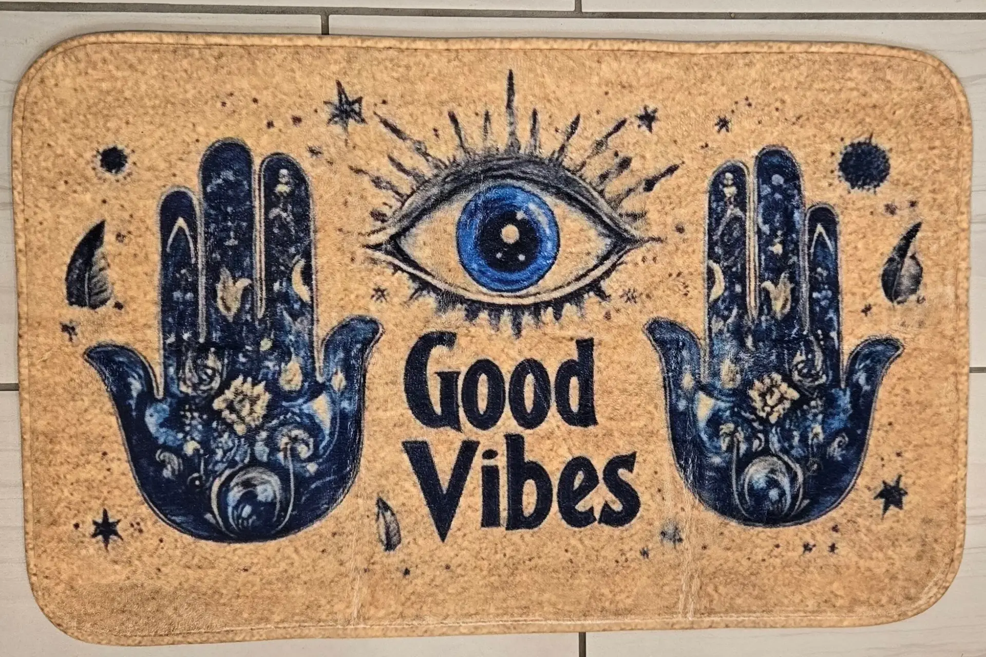Ground your space in positive energy and soulful style with the good vibes mat a stunning piece that blends art, mindfulness, and modern boho flair. Featuring open spiritual hands and the radiant Third Eye, this rug symbolizes protection, awareness, and the flow of good energy throughout your home.