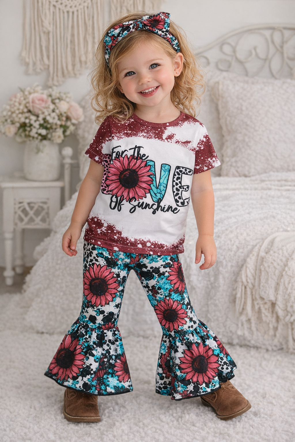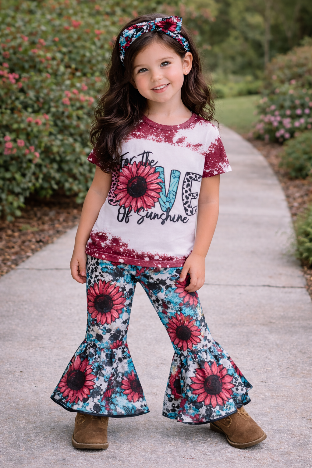 This fun two-piece outfit features a cheerful “Love of Sunshine” design paired with trendy flare pants for a look that’s playful, positive, and totally kid-approved. Perfect for little ones who love expressing big feelings with big style.