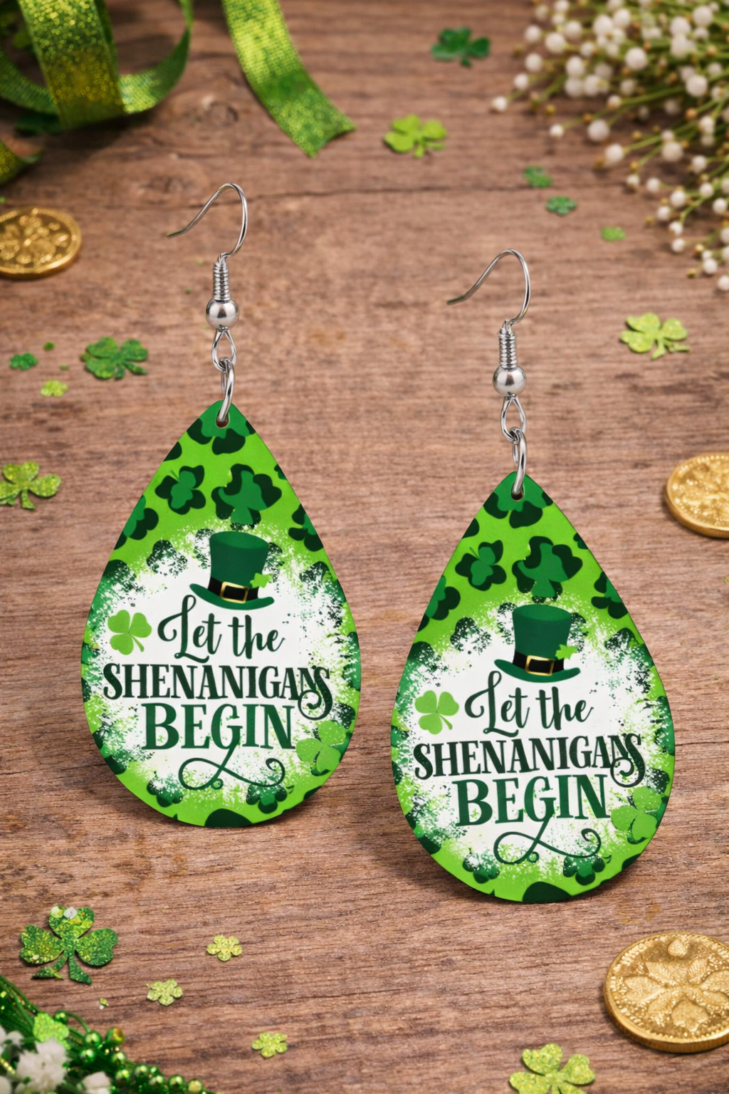 Turn heads and spark smiles with these festive teardrop earrings that are made for St. Patrick’s Day fun! Featuring a vibrant green shamrock camo design and the playful phrase “Let the Shenanigans Begin”, these earrings are the perfect statement piece for parades, parties, pub crawls, and all your lucky celebrations.