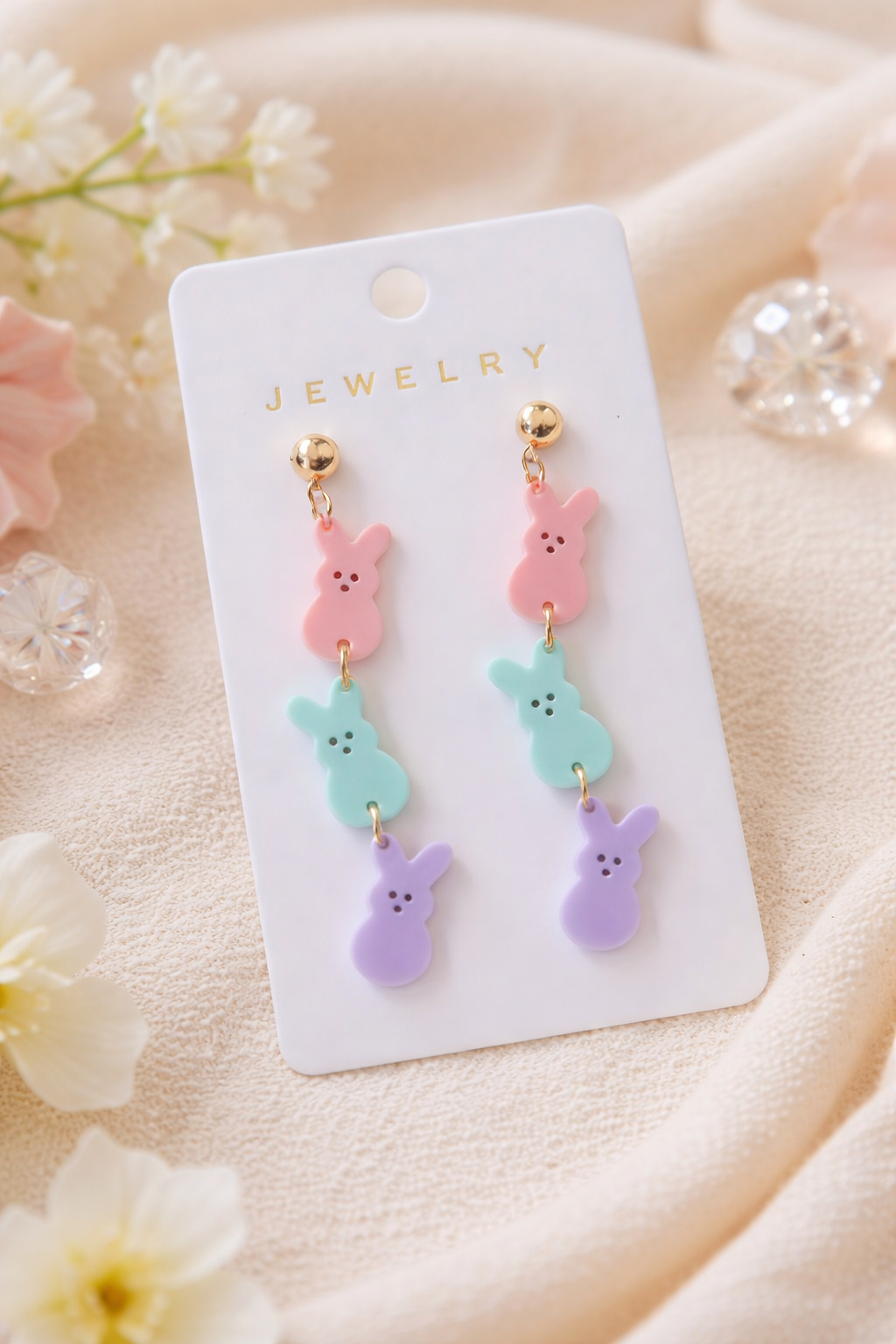Crafted from lightweight acrylic, each earring features a trio of adorable bunny silhouettes in soft spring hues—blush pink, mint green, and lavender—linked together for gentle movement and eye-catching sway. Finished with shiny gold-tone stud posts, they add just the right touch of whimsy while staying comfy for all-day wear.