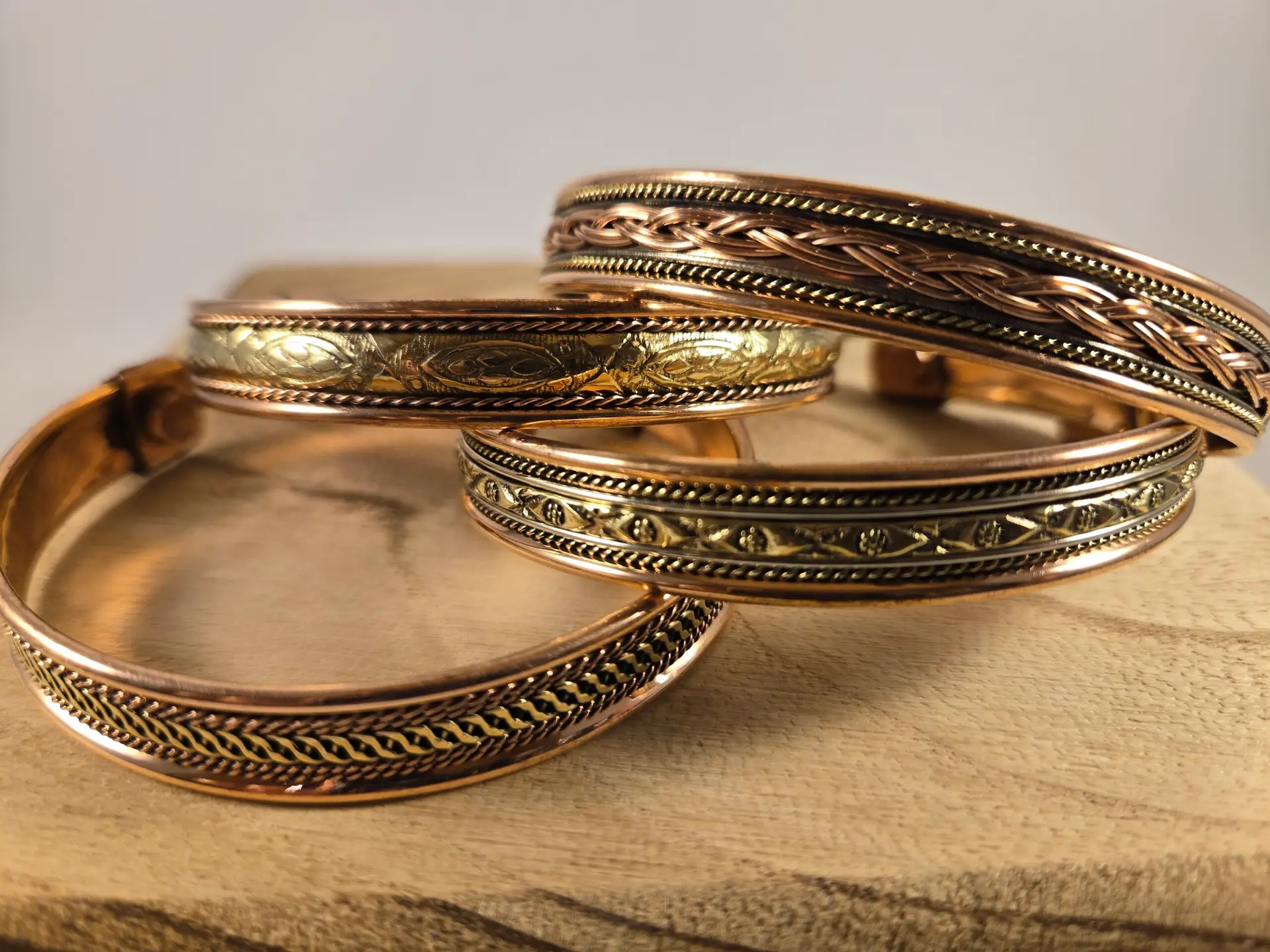 Handmade from pure copper, it features detailed engravings that showcase a fusion of Tibetan symbolism and Indian design influences. The bracelet includes discreet magnetic accents on the inner band, offering a modern touch to this classic style. Its adjustable open-cuff design ensures a comfortable fit for most wrist sizes.