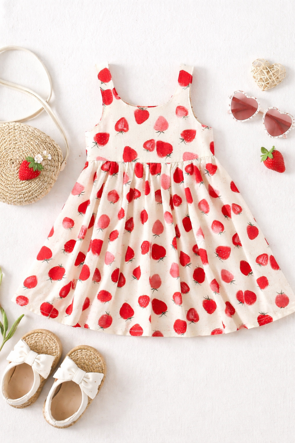 Crafted in a soft, breathable fabric, this sleeveless dress features a classic A-line silhouette with a gently gathered skirt that allows for easy movement and all-day comfort. The creamy neutral background beautifully highlights the vibrant red and pink strawberry pattern, giving it a fresh, cheerful look that’s perfect for spring and summer outings.