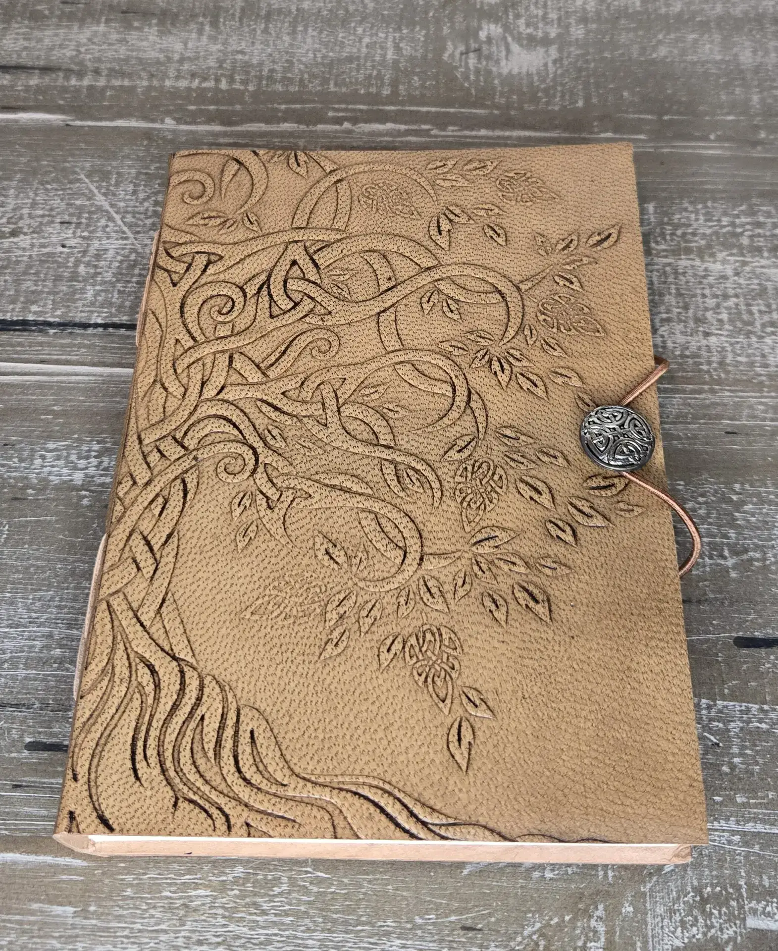 The cover is made from richly textured genuine leather, embossed with the timeless Tree of Life—an ancient symbol representing growth, wisdom, and interconnectedness. The secure button closure keeps your pages protected, making it perfect for carrying in a bag, backpack, or travel kit.